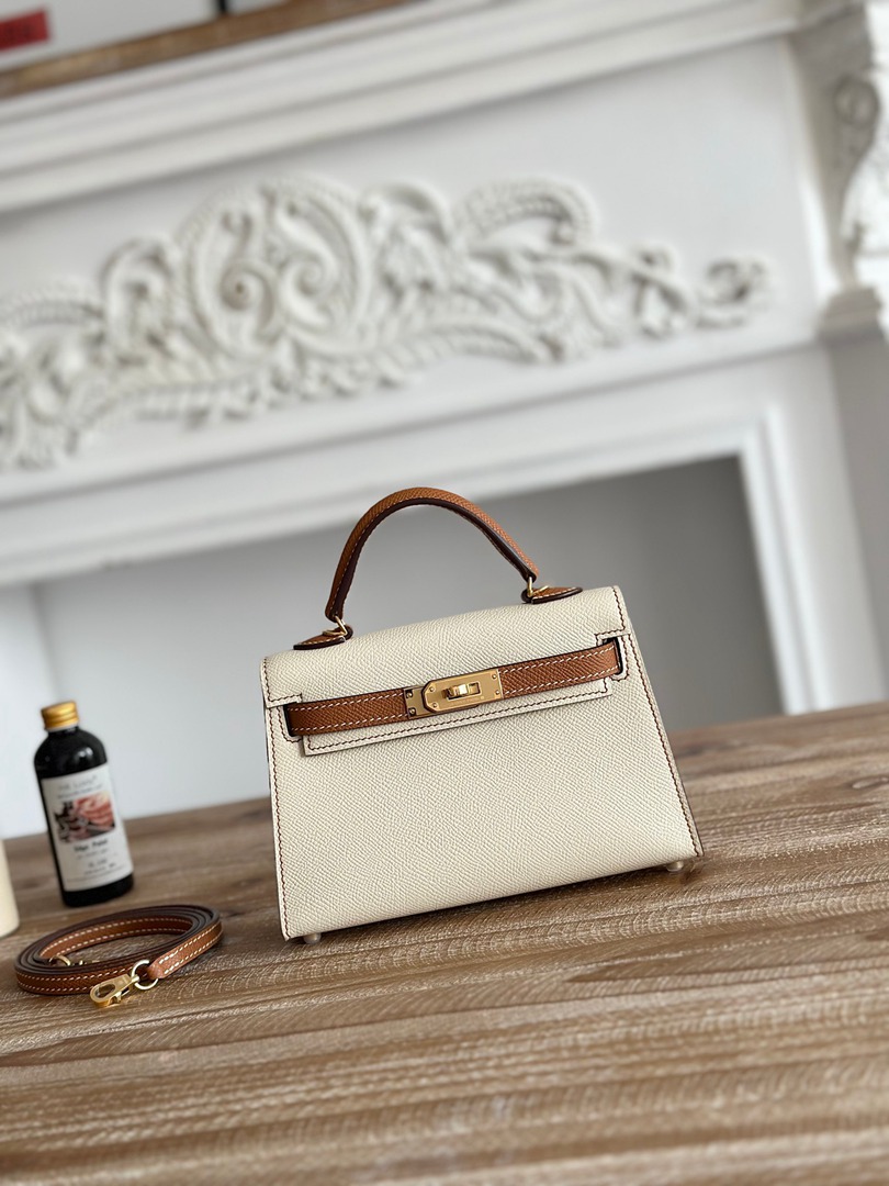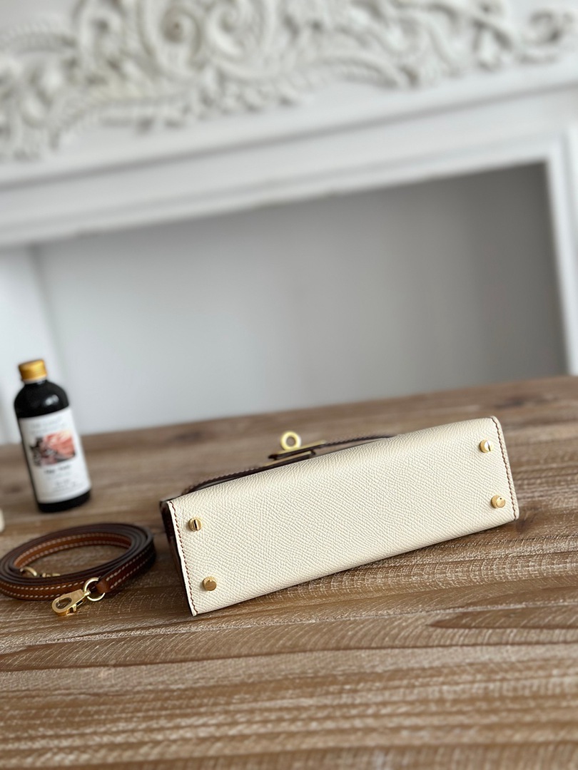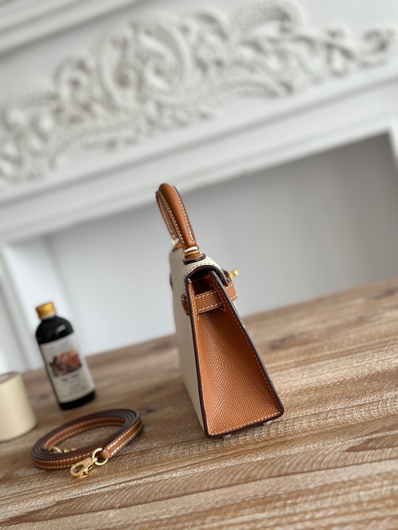 Hermes Mini Kelly II Handbag in Craie and Golden Brown Epsom Leather with Gold Hardware