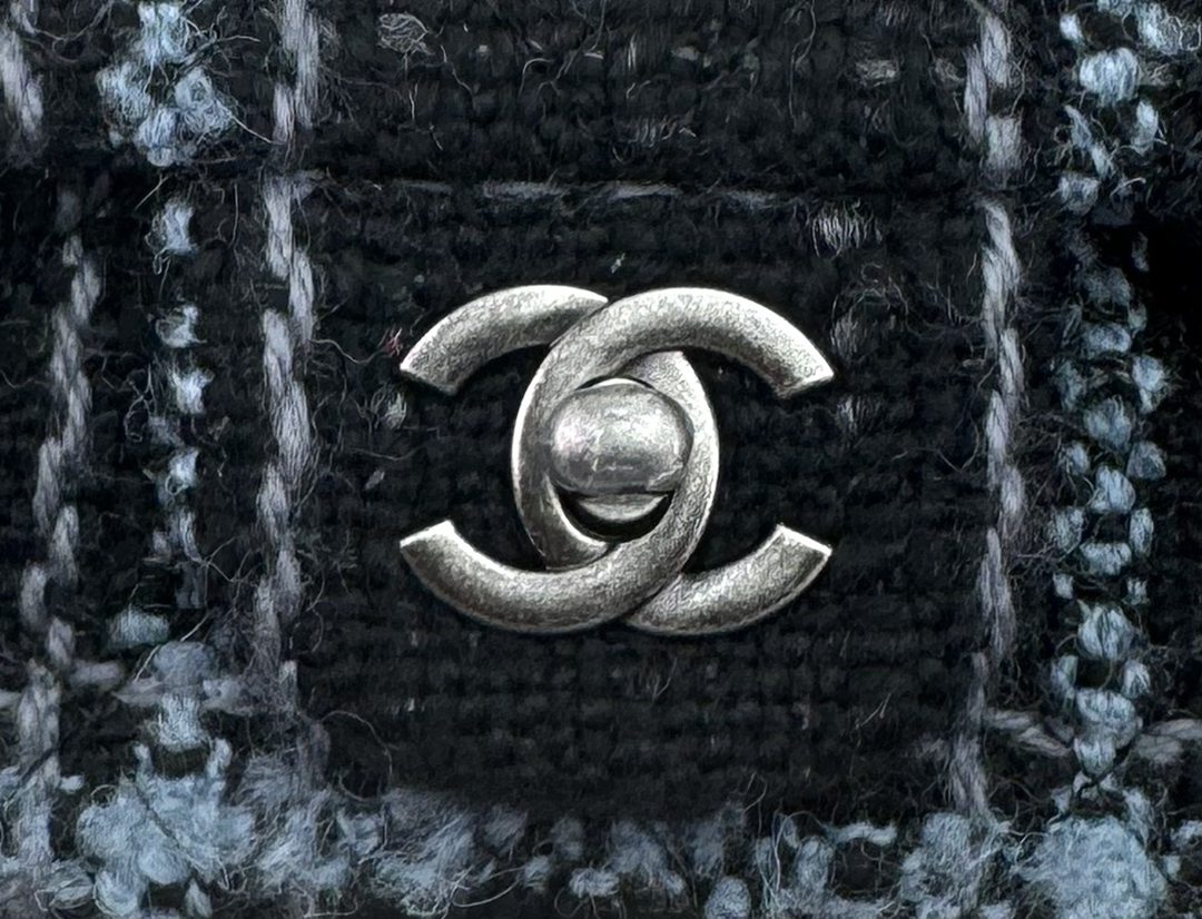chanel cf Black blue tweed sliver hardware small